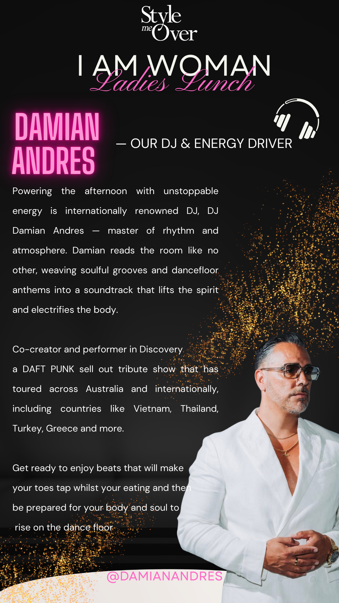 Melbourne’s own event powerhouse, Damian Andres, will set the vibe with feel-good R&B, house and nostalgic energy that gets women off their chairs and onto the dance floor.
